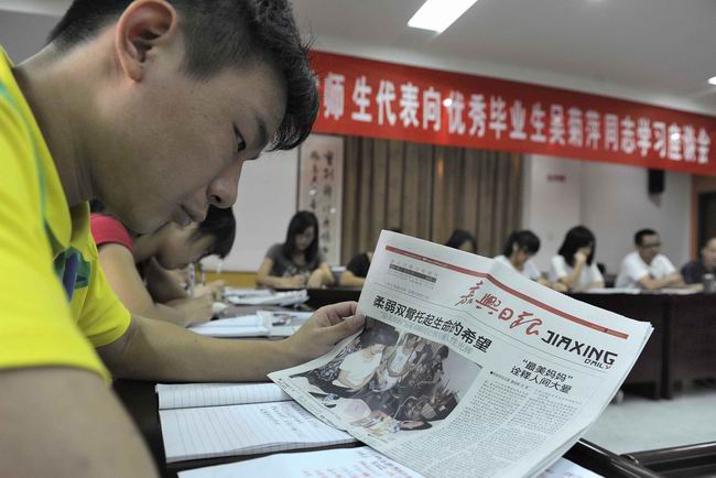 學生處副處長魯中海說,吳菊萍的先進事跡十分感人,學院已經(jīng)通過高校百事通短信平臺把向吳菊萍同志學習的通知發(fā)給了全體師生。