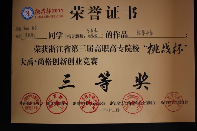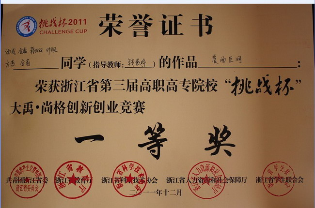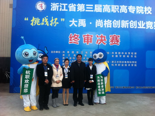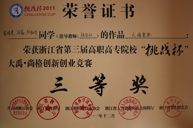 組織、動員學校同學參加本屆賽事的各項工作,自始自終得到了學院領導的高度重視,要求學院團委自6月起積極籌備比賽,精心組織、廣泛發動,并從各分院選送的作品中經過嚴格的篩選和修改,報送了六項作品參加省級復賽。在得知由工商101的湯成同學負責的《愛湯臣網》項目進入省級決賽之后,指導老師錢燕婷組織隊員們停課一周強化訓練,在學院黨委副書記沈建龍,及學生處、招就辦相關老師的大力支持下不斷改進提高。沈書記更是多次抽出時間親自指導,在比賽期間全程進行輔導,在迅速提高參賽隊伍水平的同時,也給予了隊員們極大的信心和鼓勵!盡管是第一次站上挑戰杯的舞臺,但是湯成、葉貝貝、方燕三位隊員不畏強手,充分地展示了嘉職院學子的創新精神和創業理念。負責陳述的葉貝貝同學將項目內容陳述得精煉生動、特色突出;在答辯環節,三位隊員根據各自的團隊分工,圓滿地回答了各位評委的提問,該項目最終獲得一等獎。此外,由國貿103的凌瑤雯同學負責、外貿分院副院長陸金仙老師指導的《天瑞兼職》,以及由英語093的金莉負責、外貿分院宮相榮教授和團總支書記劉慧君老師指導的《綠馨書齋》分別獲得三等獎。由于嘉職院在本次“挑戰杯”上實現了零的突破,并取得了較好的成績,因此還獲得了組委會頒發的“最佳進步獎”!