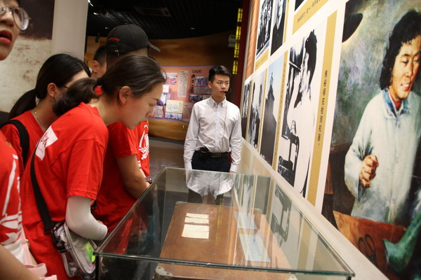 7月26日上午,全體成員首先來到焦裕祿陵園列隊舉行了簡潔而莊重的默哀儀式,向焦裕祿烈士遺像三鞠躬,表達了對革命先烈的無限敬仰和緬懷之情。隨后,全體人員步入焦裕祿紀念館,聆聽工作人員講解焦裕祿全心全意為人民服務的感人事跡。紀念館幾百幅照片,全景式展示著焦裕祿同志無數令人感動、激勵的事情。同學們在圖片前凝望、沉思……一把右扶手有洞的舊藤椅,一支不是用于寫字而是用于頂住肝部止痛的自來水筆,一輛破舊的自行車。焦裕祿就是用這些來工作的。在一年多的時間里,他跑遍全縣149個大隊中的120個生產隊,跋涉2000多公里,查清了全縣84個風口、1600個沙丘和大小河流,帶領蘭考人民治理“三害”、戰天斗地的動人場面、勤政為民的感人事跡,同學們真切地感受到了忠誠、愛民、科學、創造、實干、奉獻的焦裕祿精神的深刻內涵,面對這些感人至深的畫面,同學們感受更多的是激勵。