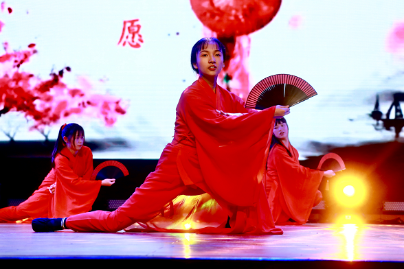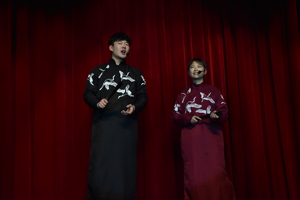 機電學院的小品《外賣來敲門》用詼諧的語言、樸素的表演,烘托出為生活努力不斷奮斗的普通人的模樣。而農建學院帶來的《茶山情歌》,則是一頂斗笠,一段曼妙的舞姿,深情展現采茶阿妹的靈動感以及神情中的脈脈情思。紡藝學子表演的相聲《吹牛》利用語言之間的魅力感染了在場的所有觀眾們。