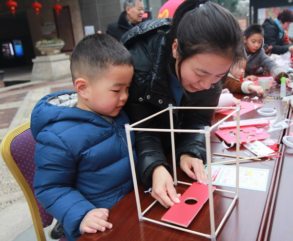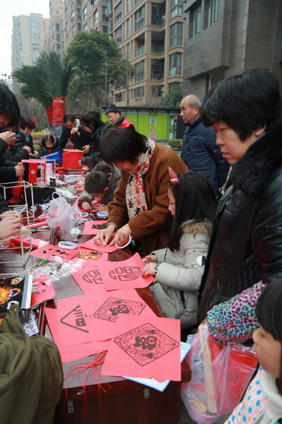 在小區(qū)物業(yè)的支持下,小區(qū)20戶家庭的家長帶領(lǐng)小朋友一同參加活動。“勤禾”志愿者們先講解制作燈籠的要領(lǐng),20戶家庭一次排開,在長條桌前大手牽小手,開始了親子手工制作燈籠的活動。家長和兒童在志愿者們的示范下,或用卷筆刀削尖桿子,或用雙面膠粘牢紅布,或把鏤空的“?!弊智哆M(jìn)去,再用桿子將燈籠挑起來,然后由鴛湖詩社的高賢老師揮毫潑墨,在燈籠的四面用毛筆書寫各種不同字體的“福”字。整個過程構(gòu)思新穎而有趣,充滿了喜感。做完燈籠,小朋友們高興地提著大紅燈籠四處“曬”寶,樂得合不攏嘴。