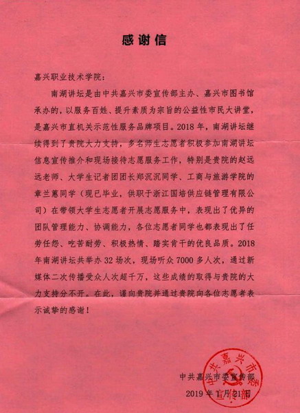 近日,校黨辦院辦收到一封來自中共嘉興市委宣傳部的感謝信,信中表示:2018年,南湖講壇繼續得到我院的大力支持,多名師生志愿者積極參加南湖講壇信息宣傳推介和現場接待志愿服務工作,為打造公益性市民大講堂、市直機關示范性服務品牌項目,服務公共文化建設做出了大量的工作。