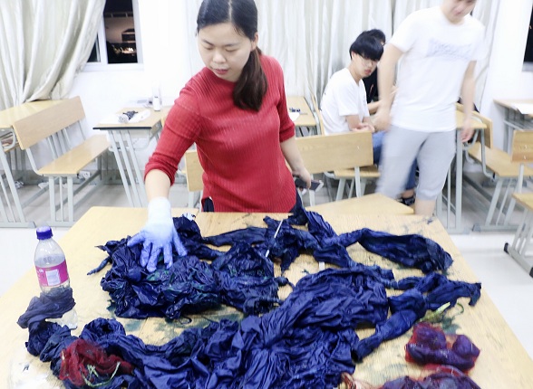 藍(lán)染作為第一批國(guó)家級(jí)非物質(zhì)文化遺產(chǎn),產(chǎn)品近年來(lái)以純潔而又樸素、鮮明而又和諧的藍(lán)白之美深受各地歡迎,特別是在嘉興,如烏鎮(zhèn)、月河、西塘等很多地方均有它的身影,充滿了江南水鄉(xiāng)之美。“藍(lán)染是國(guó)家非常注重的非物質(zhì)文化遺產(chǎn),具有二千多年的歷史。通過(guò)基礎(chǔ)扎結(jié)技法練習(xí)、扎染紋樣的創(chuàng)意設(shè)計(jì)、布藝制作,可以讓學(xué)生了解優(yōu)秀的中國(guó)傳統(tǒng)技藝,學(xué)習(xí)靛藍(lán)染色技藝,傳承民間工藝?!标悤匝嗾f(shuō)道。
