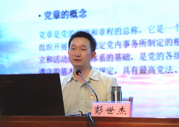 講座中,彭世杰老師在簡要進行黨章概述的基礎上,對黨章的發展歷程進行了全面梳理,隨后重點介紹了十九大黨章的內容,剖析了十九大黨章的修改亮點,并就黨員如何貫徹落實黨章進行了闡釋。彭老師指出,黨章具體條文內容隨著時代的變遷在不斷地調整,但黨章中對黨員崇高理想信念要求、嚴格的紀律約束一直未曾改變,黨章中中國共產黨為民服務的價值理念一直未曾改變,黨章中中國共產黨為民族謀復興的使命擔當一直未曾改變,這三個未曾改變昭示了中國共產黨的政黨初心與本質屬性。他強調,黨章是政黨公開樹立的旗幟,是黨內法規的“母法”,是黨員必須尊崇的總規矩,是每個黨員不斷學習終生遵守的行為規范,全黨要牢固樹立黨章意識,切實貫徹落實黨章,共同來維護《黨章》的權威性和嚴肅性。