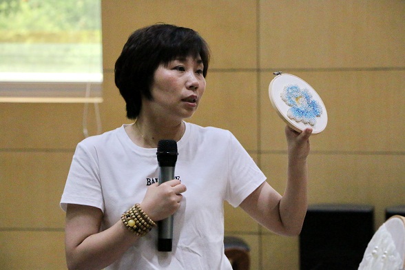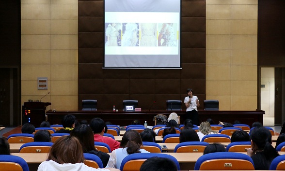 高雅文化進校園,傳統技藝進課堂。什么是手工藝?作為雅瑩集團的研發技術部經理,張利華以雅瑩歷年來的秀款為開篇,通過自身在手工藝工作上的所聞所見闡釋自己對它的獨到見解。“我在雅瑩工作了22年,每一天都覺得很開心,因為熱愛,所以一直堅持著做服裝服飾與手工藝,縱然一路走來并不是一帆風順的,但每次看到自己的成就,就會覺得值得”,她說,“為什么我們要花這么大代價做手工藝?因為我們對自己的作品有極致的追求,對自己的事業有十分的熱愛,一個高價值感、不可復制性、富有文化故事、能讓人耳目一新的創意作品,才是一個好的作品”。從被動加工到主動開發,從一線員工到部門經理,她對手工藝設計的執著與耐心,正是我們亟待學習的,也是本場講座的意義所在。