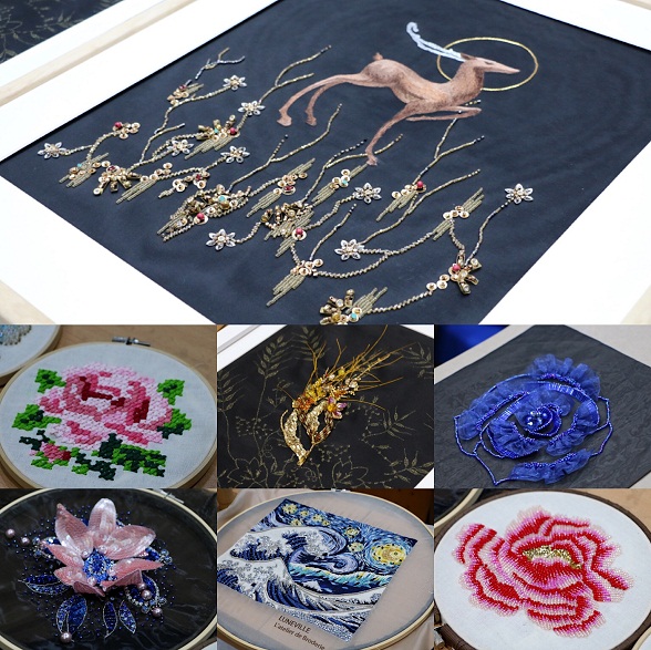刺繡,是心手合一的傳世技藝,一點一滴,無不體現匠人的心意。蘇繡、湘繡、苗繡、杭繡、法式鉤針......張利華此次帶來了工作室中的作品,通過對各類中國傳統刺繡與國外流行刺繡的針法、材料、特點講解與實物展現,幫助在場學生們更加清晰地了解手工藝韻味。在她看來,要做好一件衣服或一個裝飾,要善于將各類材料與各種秀法結合運用,這樣設計后的產品會更加精細,在體現手工藝的同時,還能創造出多種風格特色。