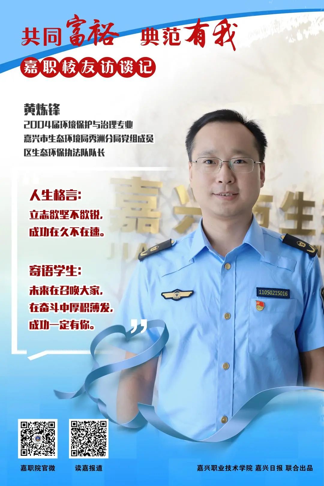 人物名片:黃煉鋒,2004屆環境保護與治理專業,嘉興市生態環境局秀洲分局黨組成員、區生態環保執法隊隊長