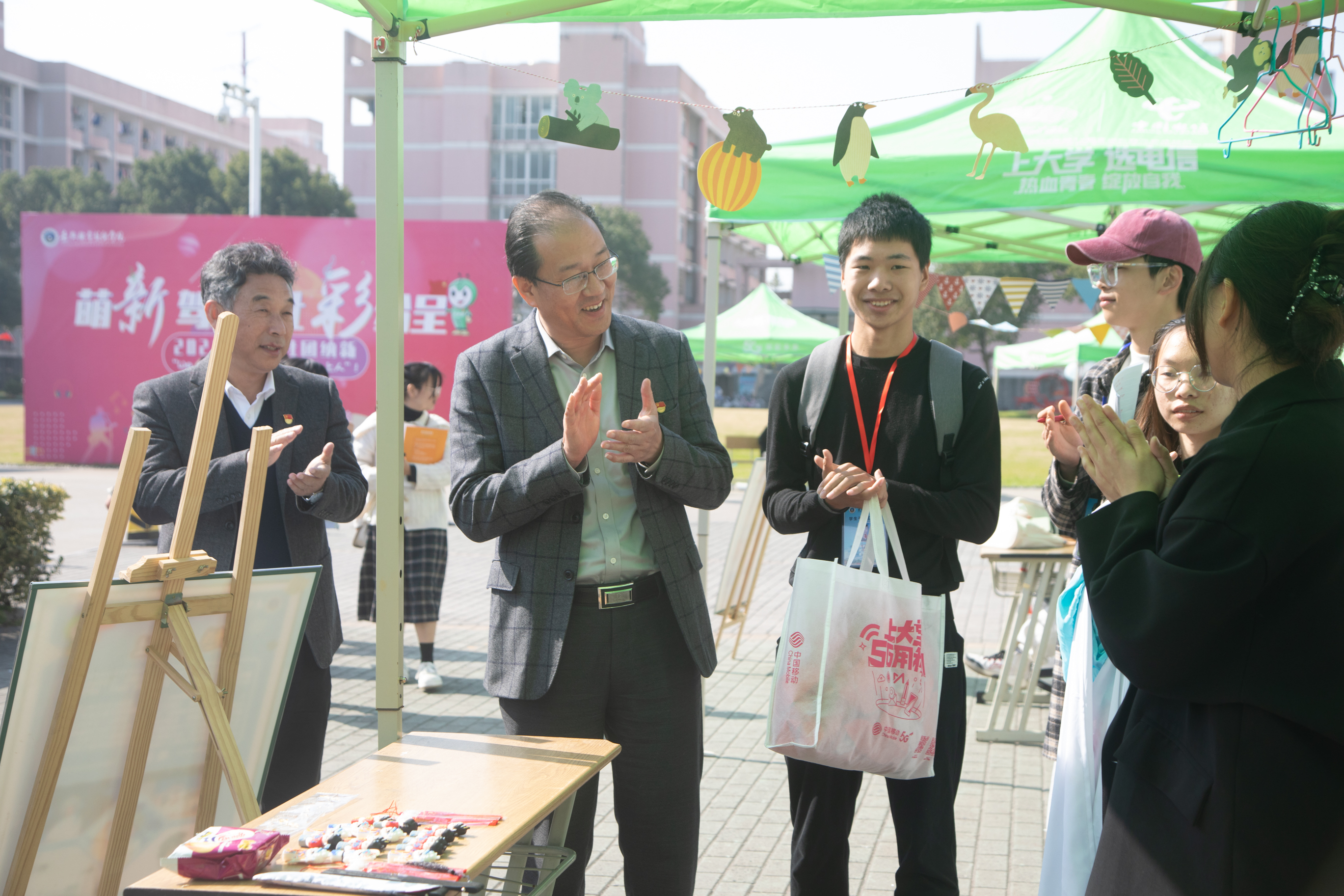 11月15日中午,方俊良書記和趙云院長來到招新現場,親切與社員們交流互動。駐足國學社攤位前,方書記認真觀看學生展演,他表示要大力弘揚并發展傳統文化,讓傳統文化走入校園,走入青年學子心中;在DIY手工社前,領導們鼓勵同學們要在實踐中提升匠能、錘煉匠心,力爭成為真正的“紅船工匠”。在詳細了解各社團發展狀況、社團活動場地等有關情況后,領導們肯定了學生社團工作取得的成效,對社團的發展方向、活動內容和活動形式等提出指導意見。