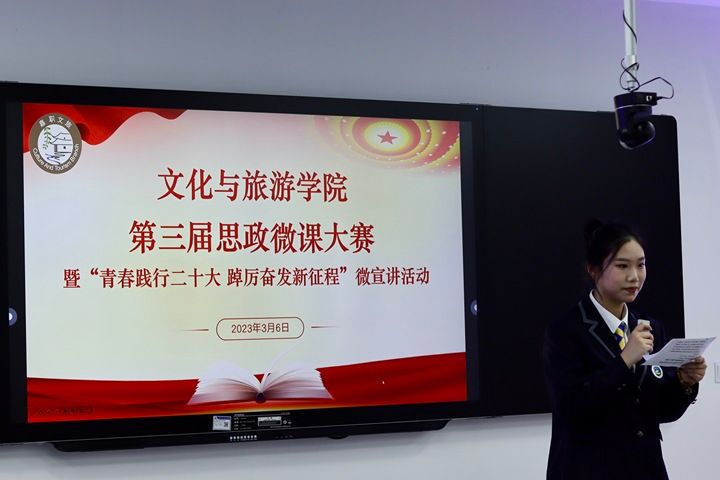 為深入學習貫徹黨的二十大精神,全面落實習近平總書記在思想政治理論課教師座談會上的重要講話精神,為學生的成長和發展搭建交流、學習與展示的平臺,3月6日晚上,文化與旅游學院舉辦“青春踐行二十大,踔厲奮發新征程”思政微課微宣講比賽,以賽促學、以賽促優,在宣講中引導學生互相學習、共同進步。