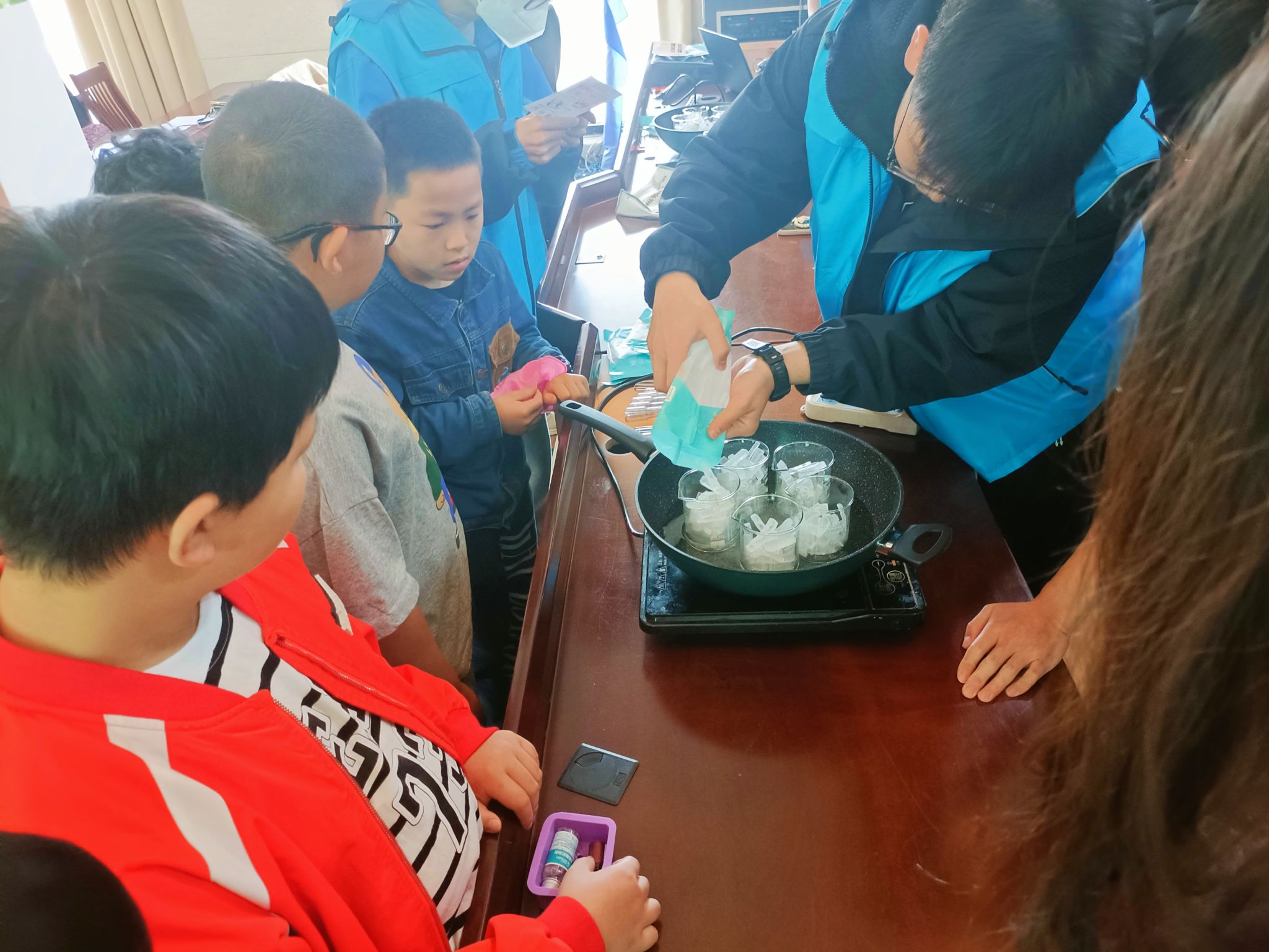 手工DIY精油香皂活動中,小朋友們在志愿者的幫助下,用靈巧的雙手DIY精美的肥皂,大家在溶解、制作過程中親自動手?jǐn)嚢瑁瑢ψ约赫{(diào)配出的色彩紛呈的香皂愛不釋手。