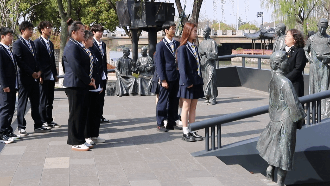 從火車站出發,經過宣公橋來到獅子匯渡口,實踐團成員佇立于“一大”代表們的銅像旁,聽指導教師講解他們的生平事跡。這些雕塑惟妙惟肖地展現了“一大”代表在渡口等船來的場景,熱血青年的音容猶在,開啟革命新征程的浩然正氣深深感染著在場的每個人。