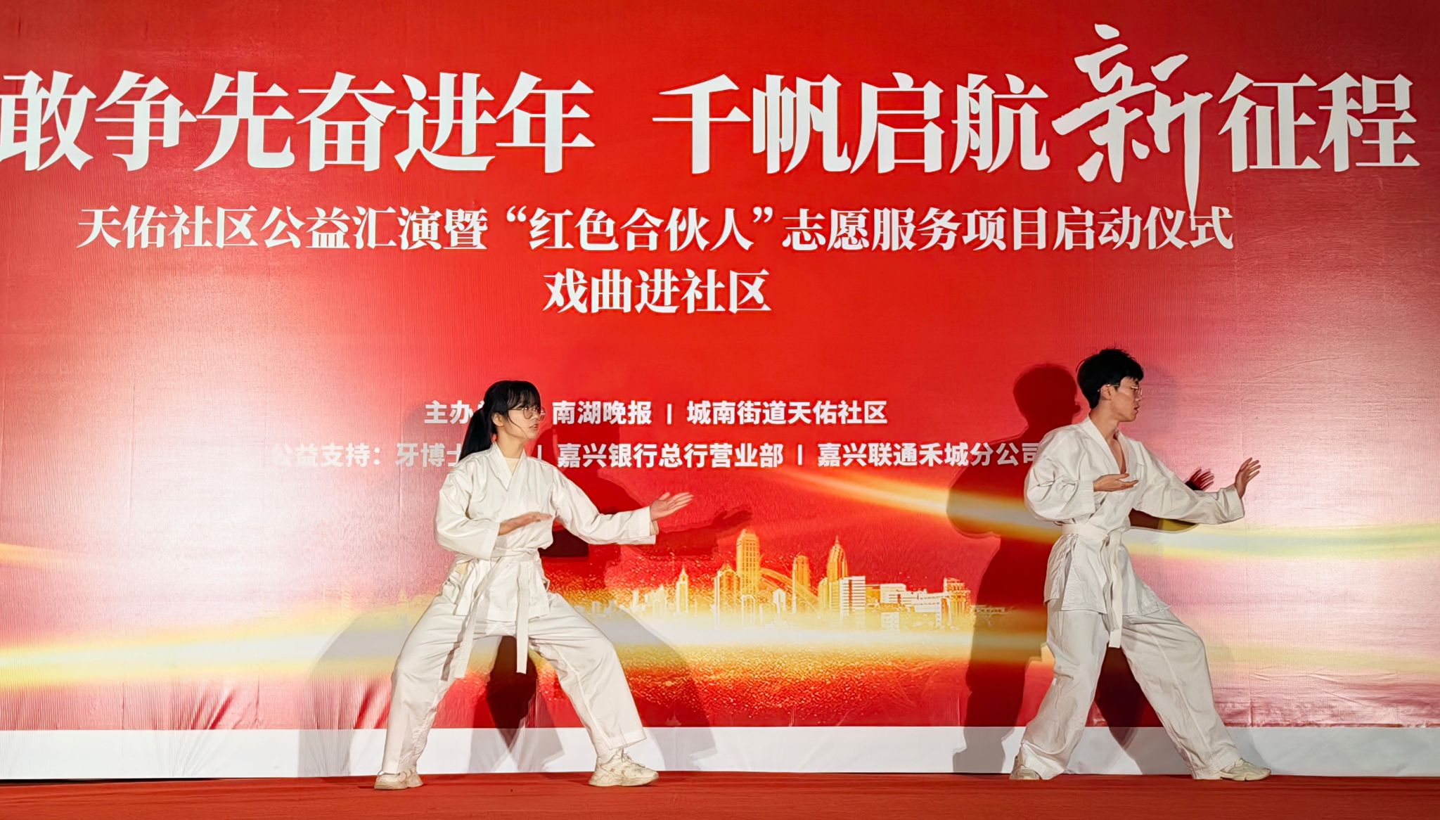紅船青馬營大學生志愿者不僅積極參與嘉興市公共文化品牌建設,還積極參加社區文化活動。前不久,紅船青馬營4名大學生志愿者在嘉興市經開區天佑社區黨群服務中心“四敢爭先”文藝晚會上亮相,帶來詩歌朗誦、空手道等精彩表演,贏得了社區工作人員和市民的一致稱贊。