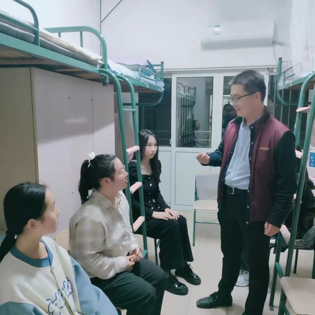 “專業學習方面有困難嗎?”“臨近期末考試了,大家要自己合理安排時間,提前做好考試準備。”“在課程學習中出現的一些問題,要及時與老師溝通,解決自己的知識盲點。”“住宿住得習慣嗎?”“空調效果好不好?”老師們從學習以及日常生活細節處對學生進行關心,宿舍里時不時傳來歡聲笑語。