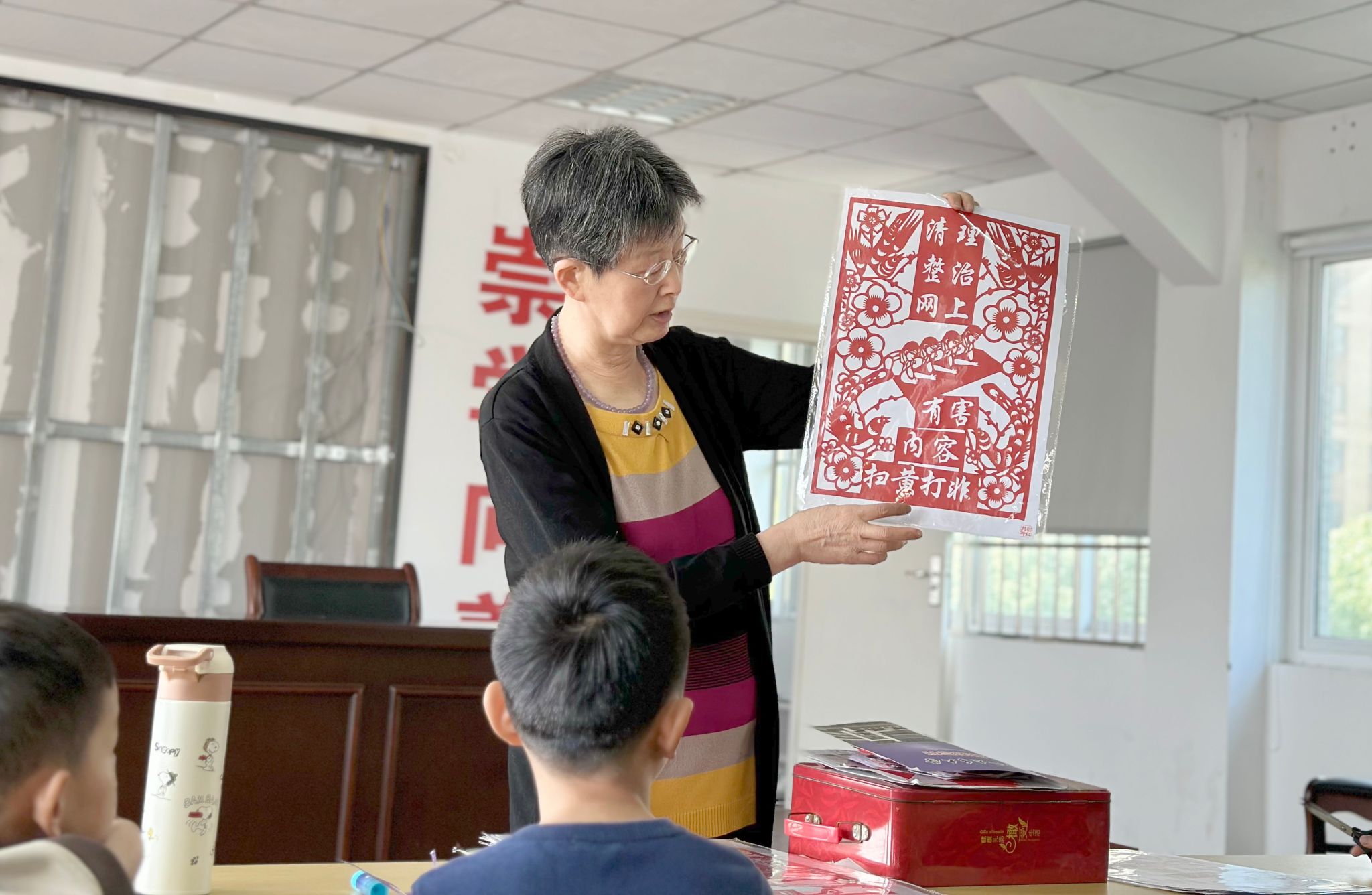 課堂上,胡紅月向小朋友們展示了單色剪紙、套色剪紙、折疊剪紙等眾多不同種類的剪紙作品。《南湖兒女》《喜迎二十大》《不忘初心 牢記使命》《喜迎亞運》《“八八戰略”在身邊》等紅色題材的剪紙作品,繁復而精致,凝聚了作者大量的心血,通過觀賞,大家對剪紙藝術有了更深入的了解和感悟。