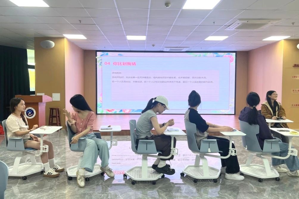游戲環節,學生們通過抽簽隨機組成五人小組,開啟“各位好漢請抱拳”“看眼色報數”“你比劃我猜”等一系列團隊游戲,大家在游戲中釋放了壓力,在互助中懂得了團隊協作的重要性。