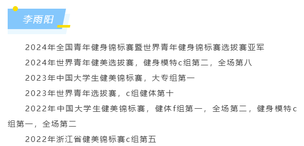 李雨陽進入大學不久后就開始接觸健身,他說這三年沒有一天是荒廢的,“雖然很累但也很充實,我站在與本科院校體育學院的學生同臺競技的舞臺上,雖然年齡小他們很多,訓練時間也少很多,但是我代表的是嘉職院,我告訴自己是一定要拿到好成績的,在每項有幾百個參賽人次的項目中,我每次都取得好成績,讓廣播大聲喊出了我們學校‘嘉興職業技術學院’的名字,我是非常驕傲且自豪的,希望未來我也能成為學弟們的精神氮泵,激勵他們前行沖擊更好的舞臺,讓我們學校發展地越來越好。”