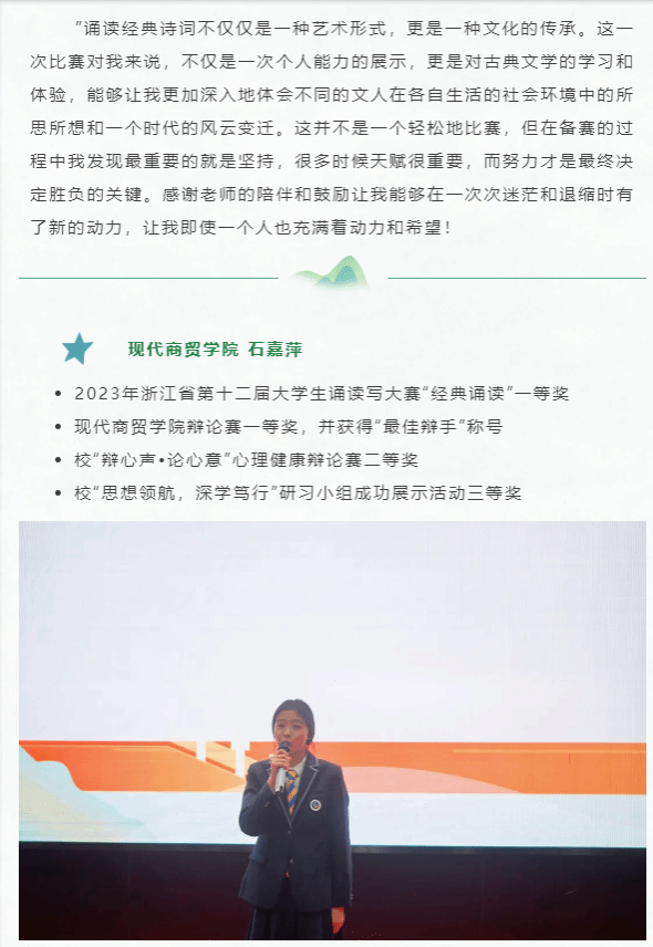 一等獎指導教師唐惠華說:“開展中華經典誦讀競賽,不僅可以給師生提供一個了解中國傳統文化、繼承民族智慧的平臺,也豐富了我們的校園文化生活。這些經典是我們民族文化的典范,是人類的共同財富,是啟迪一代又一代人的中華智慧、豐富我們情感世界的精神源泉。”