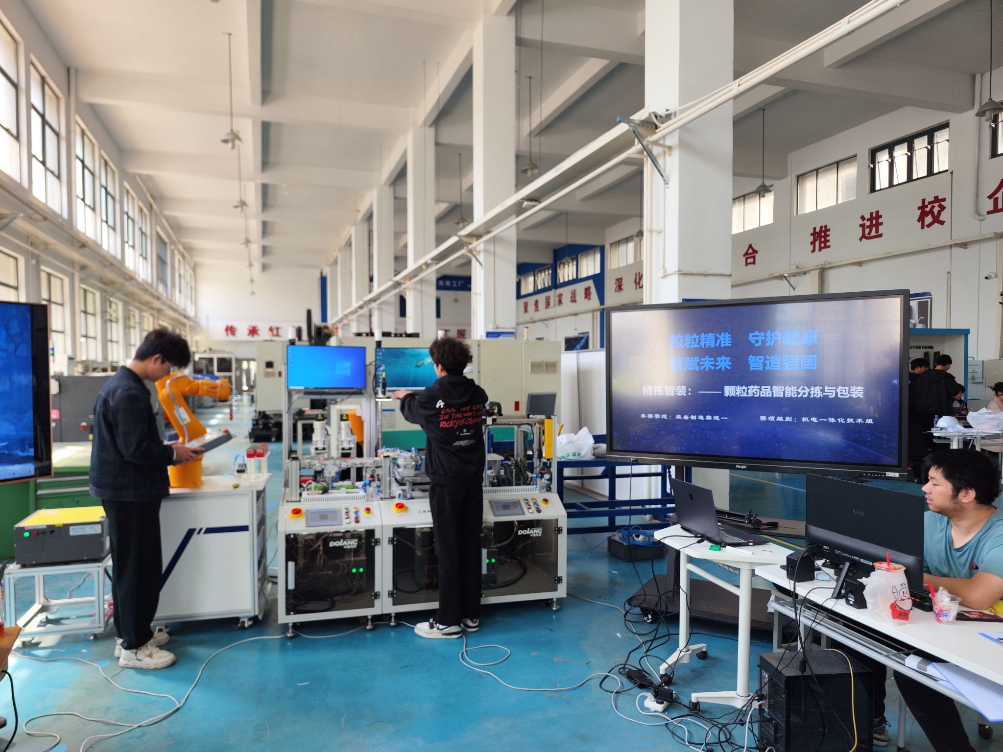 備賽階段,參賽團隊精心籌備比賽,指導教師針對賽項技術要求制定周密訓練計劃,從設備平臺布局到機器人系統自動化運行,從應急場景模擬到展示訓練,每個階段都精心打磨,充分展現了嘉職師生“精益求精、勇于創新”的工匠精神。