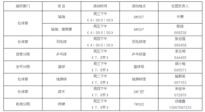 在全民積極倡導“每天鍛煉一小時,健康工作五十年,幸福生活一輩子”健康文明生活方式的大背景下,為了豐富廣大教職員工的業余生活,展現我院教職工積極向上的精神風貌。希望大家根據自己的實際情況,選擇適合自身的項目積極參與鍛煉,根據上學期各社團活動的實際情況,經工會研究,本學期社團重新組團活動安排表作如下調整: