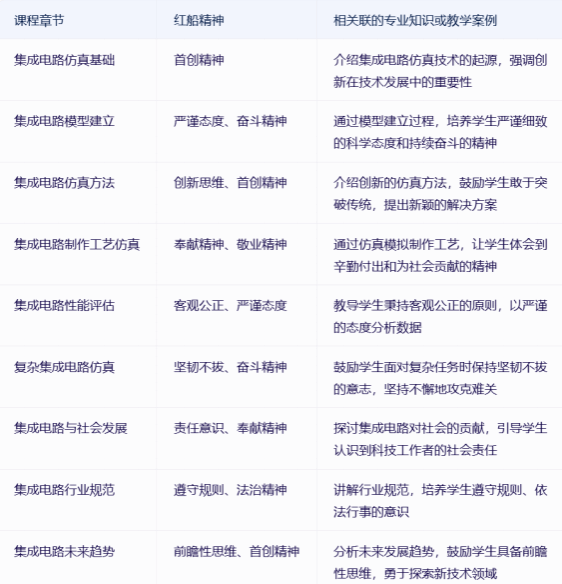 在當今科技迅猛發展的時代,集成電路產業作為國家戰略新興產業的關鍵一環,對經濟社會發展和國家核心競爭力具有重大意義。隨著信息技術的持續革新,集成電路設計與制作技術日新月異,高素質技術人才的需求愈發迫切。為此,《集成電路仿真與制作》課程致力于通過理論與實踐結合的方式,培養學生在該領域的專業技能和創新能力。然而,傳統教學模式偏重專業知識的傳授和技能的訓練,忽視了學生思想道德素質、創新精神和家國情懷的培養。為適應新時代高等教育的發展需求,提升教學質量和育人效果,將紅船精神融入課程思政顯得尤為重要。紅船精神作為中國革命精神的重要源頭,蘊含著豐富的思想內涵和時代價值,對于培養新時代大學生的愛國情懷、創新精神和社會責任感具有深遠意義。將紅船精神融入該課程,不僅能豐富教學內容,提升學生的學習興趣和動力,還能引導學生樹立正確的世界觀、人生觀和價值觀,促進其全面發展。在此背景下,本課程的建設旨在深入挖掘紅船精神與集成電路技術的內在聯系,將紅船精神的核心要素融入課程教學的各個環節,構建具有鮮明特色的課程思政體系。通過該體系的實施,旨在培養學生的創新精神、實踐能力和社會責任感,為國家和社會培養更多高素質的技術人才。