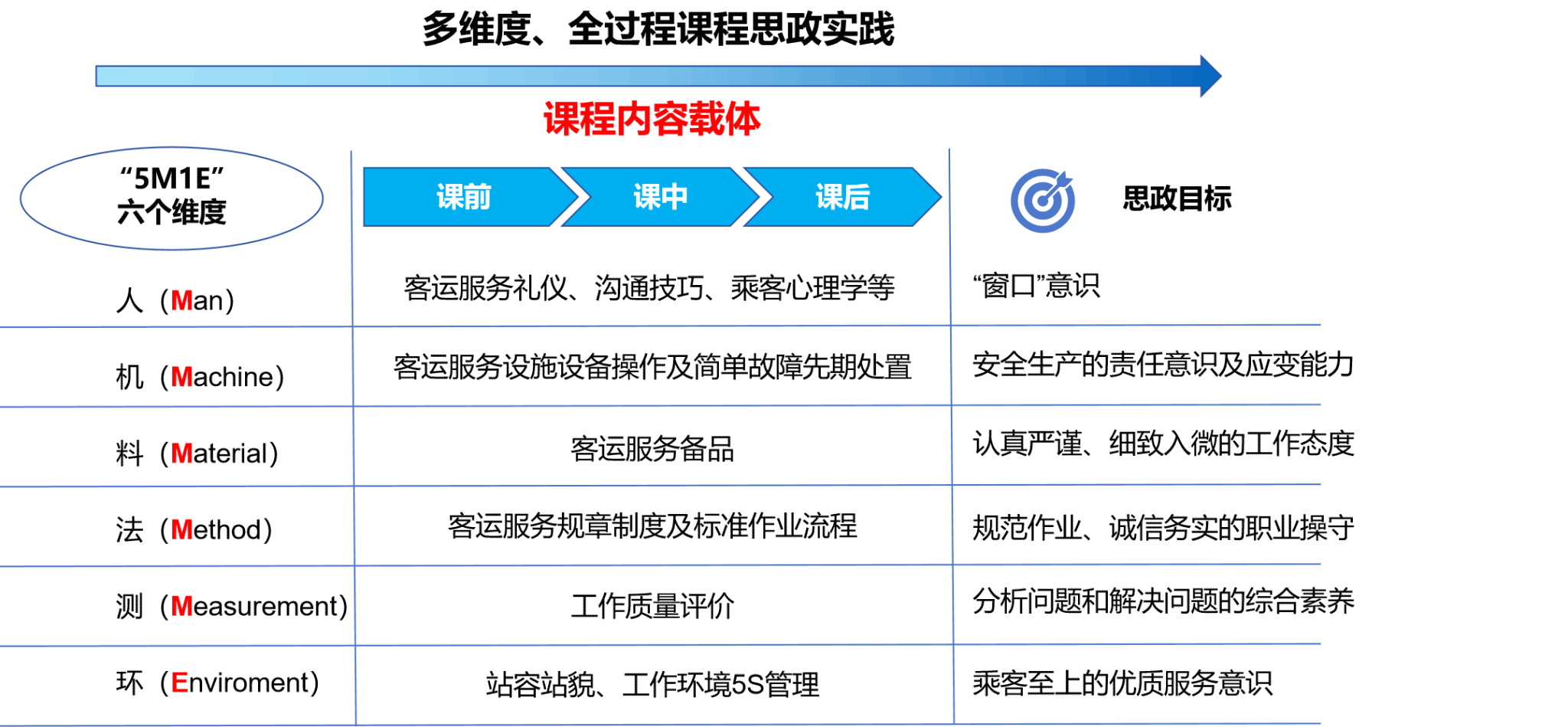 高職院校的軌道類專業,肩負著為軌道行業培養輸送高素質一線技術技能人才的重任。如何在軌道專業課程中有效實施課程思政,培養學生精益求精的工作素養、用戶至上的服務意識、安全運營的質量意識具有非常重要的意義。當前城市軌道交通類課程思政研究表現為以下幾個方面:一是課程思政研究的切入點多從具體的城市軌道交通類專業課程入手,且多以《城市軌道交通概論》這門課為研究對象,在研究中結合專業課程的特點、內容及培養目標,針對性地凝練課程思政元素,對專業課程的思政元素進行了較為系統全面的挖掘;二是在思政元素的融入載體選取上,多以典型案例、人物事跡等方式呈現,在具體的教學實踐中多以講授的形式展開,且關于分類建設課程思政資源庫的探討較為充分;三是對思政教學效果的評價方法展開了深入的探討研究,提出了多方位、全過程、手段豐富的用于評價課程思政效果的評價反饋機制。但筆者認為,當前的研究還存在一定的不足,例如對專業課程中思政元素的具體實施模式創新還不夠,對于思政元素的融入探討還不夠深入,落實課程思政的方式還不夠豐富。基于此,本文以《城市軌道交通客運服務》課程為例,創新性地提出了課前、課中、課后的全過程課程思政實施模式,結合具體課程內容詳細闡述了該模式的實踐方式,從人、機、料、法、環、測六個維度,課前、課中、課后全過程實現思政元素的深度融入,以潤物無聲的方式,潛移默化中落實專業課程的思政育人功能,實現學生在服務形象、服務意識、服務態度、服務知識、服務技能方面的全方位提升。