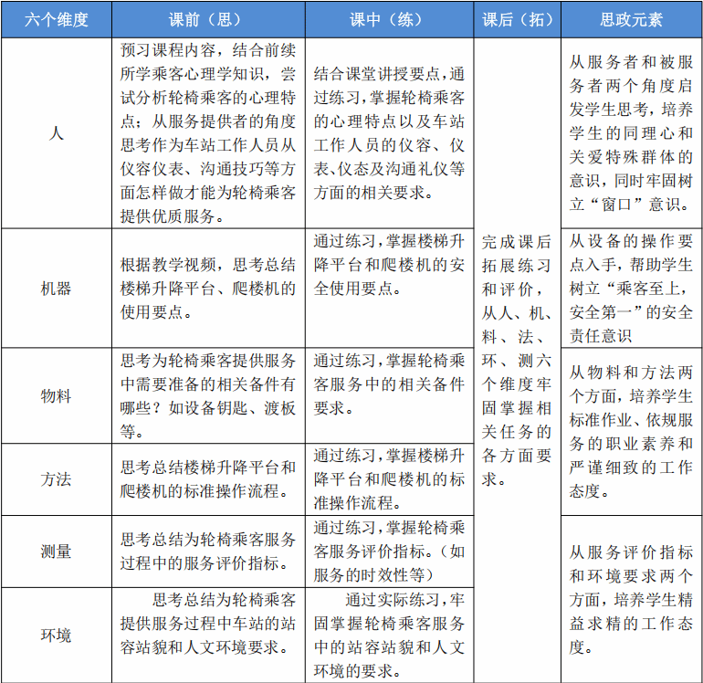 高素質、高水平的軌道交通客運服務人員是實現軌道交通行業良性發展的先決條件。《城市軌道交通客運服務》課程的思政內涵,就是培養軌道交通企業中與乘客直接接觸的高素質一線技能型人才,以建設交通強國的大局意識、牢固的安全意識和扎實的專業技能保障乘客的生命財產安全,以得體的儀容儀表、規范的服務技能、熟練的溝通技巧為不同乘客群體提供優質、貼心的客運服務,以良好的應變能力處理突發狀況,展示軌道交通企業良好的服務形象,增強軌道企業的競爭力,提升企業效益。本文將現場管理中理念引入課程思政的教學實踐中,創新性地提出了“六維一體”課程思政的實施模式,并結合《城市軌道交通客運服務》課程中的典型工作任務《輪椅乘客服務》進行詳細闡釋,構建了課程思政實施的新路徑,從六個維度全方位、全過程、全面深入實施課程思政,可以更好地發揮課程思政的隱形育人功能。