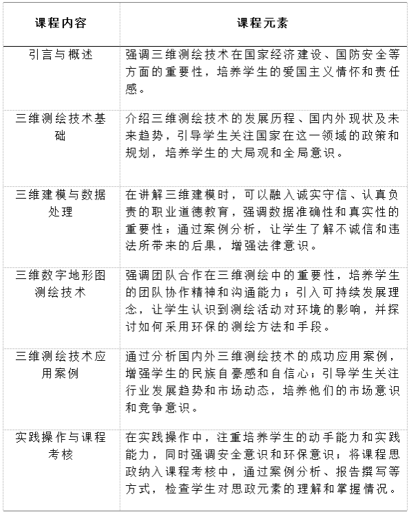我們挖掘了三維測繪技術與國家建設、民族復興之間的內在聯系,將具有時代特征的思政元素融入了課程,使課程內容更加豐富、生動。我們通過講述測繪人在國家重大工程項目中的奮斗歷程和感人故事,激發了學生的愛國情懷和對測繪事業的熱愛。同時,我們還結合國家發展戰略和行業需求,引導學生將個人理想與國家需求相結合,為實現中華民族偉大復興的中國夢貢獻力量。