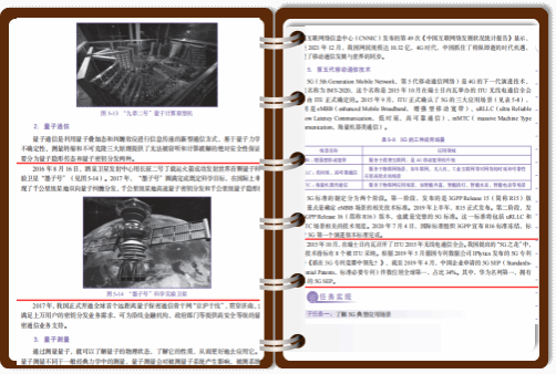 模塊五在介紹量子通信發展時,重點介紹了“墨子號”衛星和“京滬干線”的建成,在介紹5G通信技術時,重點介紹我國在5G移動通信領域的快速發展和卓越貢獻,讓學生了解該技術發展現狀的同時,啟發學生的創新意識,點燃學生的愛國激情,激發學生建設數字強國的自信心和使命擔當。圖4為模塊五“信息新技術”部分節選。