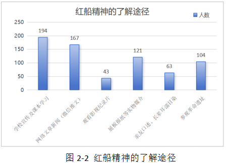 針對紅船精神的了解途徑這個維度分析,通過學校宣傳及課本學習有194人,通過網(wǎng)絡文章新聞(微信推文)有167人,通過觀看影視紀錄片有43人,通過展板報紙等實物媒介有121人,通過親友口述、長輩耳濡目染有63人,通過參觀革命遺址有104人,如圖2-2所示。