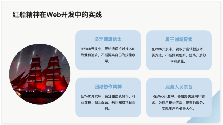 課程內容體系涵蓋了Web開發的核心技術模塊,包括前端技術、后端開發、數據庫管理和Web應用部署。針對大三階段的學生,課程設計了多個理論與實踐結合的教學環節,通過實驗室實踐、項目開發等方式,使學生在真實的開發環境中應用所學知識。此外,課程還設置了專題討論和案例分析環節,引導學生探討如何在技術開發中踐行紅船精神的內涵。