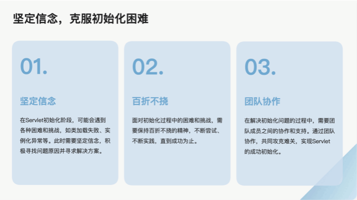 在講述Servlet的生命周期時,融入紅船精神中的“堅定理想、百折不撓”。Servlet的生命周期包括初始化、處理請求和銷毀,強調了一個系統從構建到結束的完整過程,這與紅船精神中對理想的堅持相契合。通過對比Servlet的生命周期和個人職業生涯的發展歷程,教育學生在面對挑戰和困難時,要始終保持堅定信念,不斷優化和提升自己的技術能力。