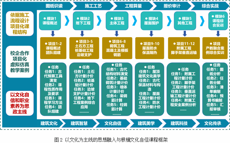 習近平總書記多次提出:“文化是一個國家、一個民族的靈魂。”建筑作為文化的載體和符號,承載著中華五千年的文化記憶和歷史文脈。課程建設在習近平新時代中國特色社會主義思想指引下以文化為主線,通過“建筑智慧+傳統文化”根植文化自信。將建筑智慧和優秀文化、歷史建筑和人物、大國工程和事跡融入教學,創新構建“建筑文化-建筑智慧-文化自信-建筑美學-建筑科技-文化傳承”的建筑文化育人鏈條,并將精益求精、精準算量、嚴格審計等職業素養貫穿教學始終,結合課程特色以建筑文化為載體將習近平新時代中國特色社會主義思想落在實處。