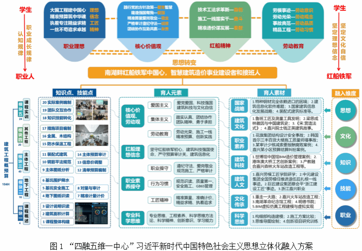 《建筑工程預算》課程為工程造價專業核心課,6學分,104課時。2021年立項為浙江省第一批課程思政示范課。通過產教融合多方協同構建“四融五維一中心”紅船精神融入專業課程思政育人體系。立足課程預算特色,以“南湖畔紅船鐵軍中國心,智慧建筑造價事業建設者和接班人”為中心,培養服務本土,會識讀、懂施工、精預算、能審計的“紅船預算鐵軍”。
