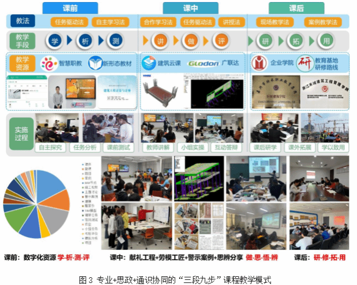 紅船精神融入專業課程教學,課程團隊是關鍵。一方面專業教師政治理論學習深度和育人元素挖掘能力有待加強,另一方面專業課與思政課、通識課的協同不夠。思政育人既需要鹽溶于湯的潤物無聲,又需要借助信息技術用學生喜聞樂見、樂于接受的方式開展。通過思政課、通識課教師和專業課教師構建教學團隊,充分挖掘思政元素,實施“專業課-思政課-通識課”的協同教學,將紅船精神結合地方紅色基因、傳統文化和建筑文化等有機融入專業課程。通過“專業+思政+通識”復合型課程團隊建設,實現教學資源共建共享、集體備課集中研討、雙向互動課堂呼應。專業課、思政課和通識課協同構建“三段九步”教學模式(三段:課前、課中、課后;九步:學析測、講做評、研拓用),提升課堂協同育人水平,優化融入效果。