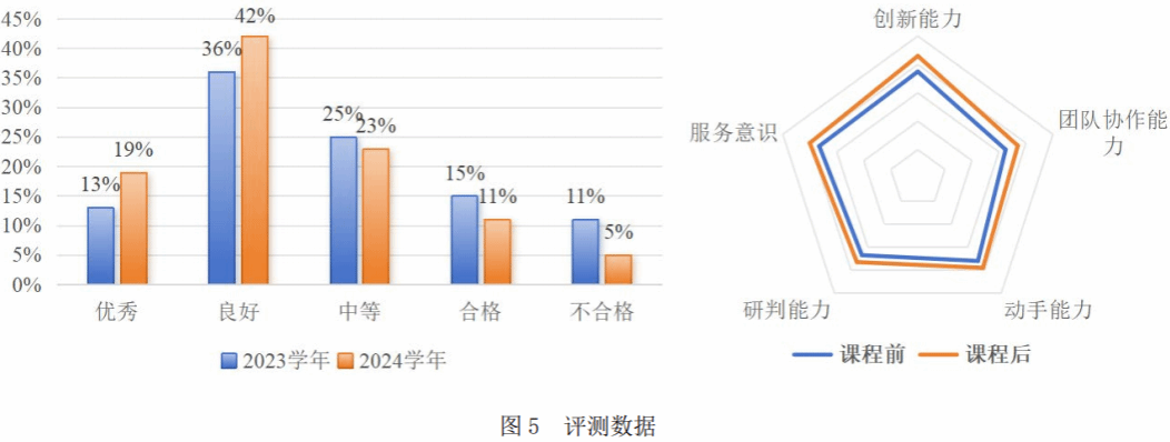 課程學(xué)習(xí)目標(biāo)不僅是對(duì)專業(yè)知識(shí)的學(xué)習(xí),更是學(xué)生綜合能力素質(zhì)的提升。通過以“紅船精神”為主線的思政主題融入,學(xué)生在知識(shí)、技能、道德、團(tuán)隊(duì)、社會(huì)意識(shí)、崗位適配度等各方面均有所提高。分析 2023 年與 2024 年學(xué)生總結(jié)性考試成績(jī),提升效果達(dá)到 10%以上。學(xué)生課程前后評(píng)測(cè)數(shù)據(jù)如下: