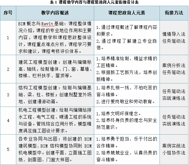 基于人才培養方案,以BIM行業標準為抓手,校企共建智能建造基地,實施現代學徒制共育高素質工匠。以工匠精神為引領,以實際工程圖紙為教學案例,以施工現場為學生實習場所,以小組為教學單元,有機融合“安全責任、守正創新、奮發團結”為核心的工匠精神,培養專業過硬、政治可靠的高素質工匠。教學內容與育人元素具體銜接設計見表1。