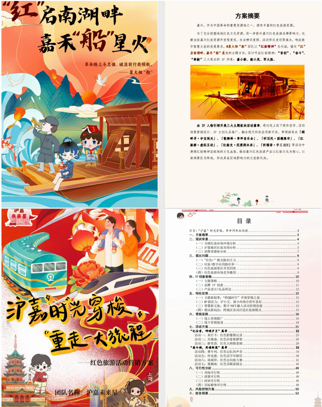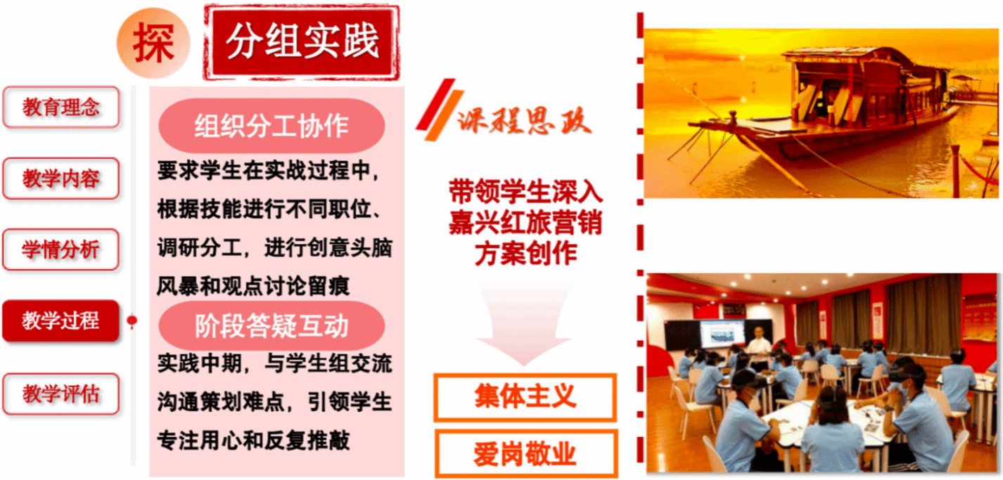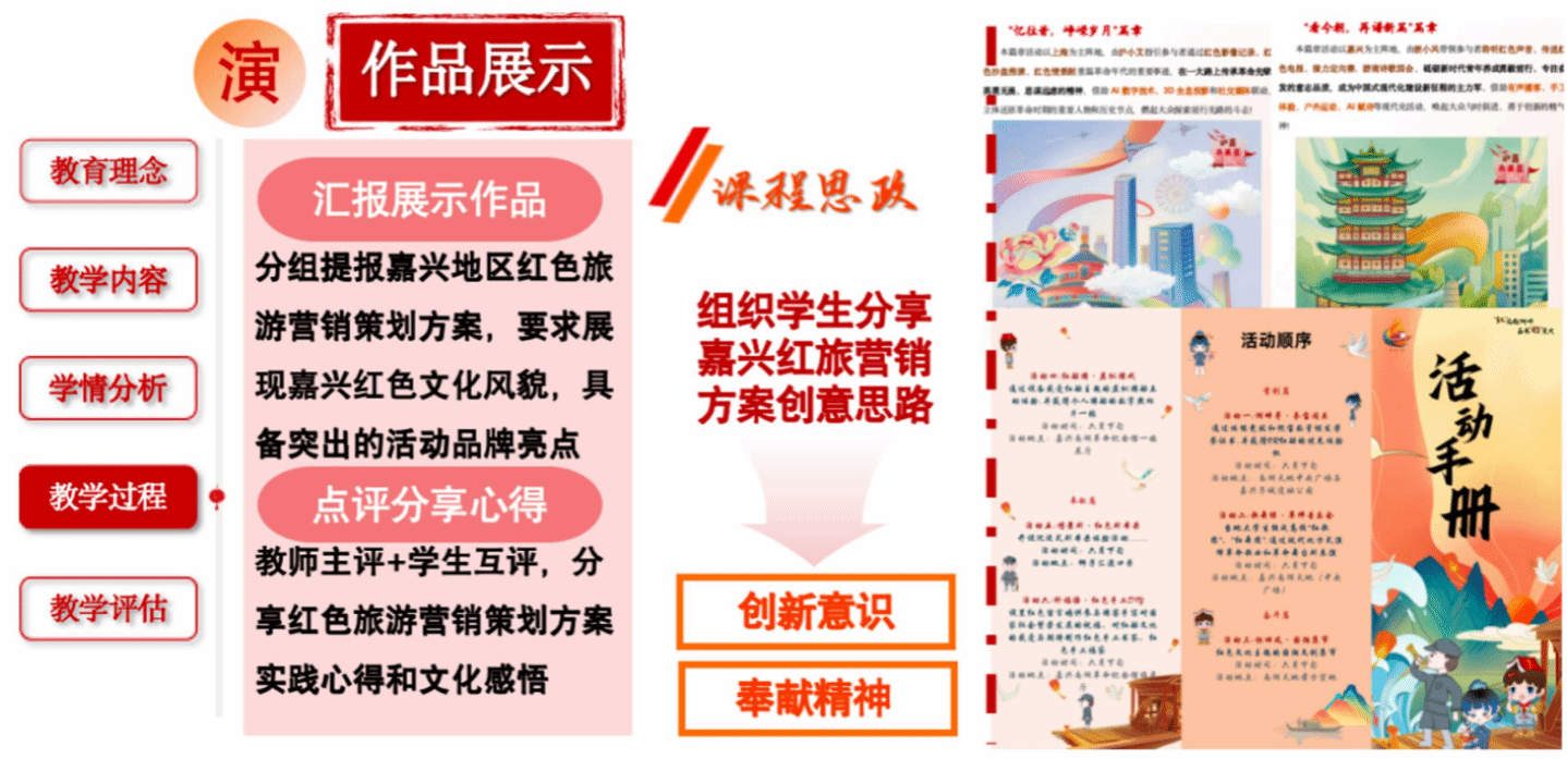 從調研方法到作品實踐,學生在首創、奮斗、奉獻精神的鼓舞下從校內延伸到校外,積極開展嘉興地區紅旅營銷策劃方案作品打磨,團結協作進行全流程專業實踐,展現了從課程思政到實踐思政的教學方式轉換,從而帶領學生堅定文化自信、提升技能水平、施展創意才華。
