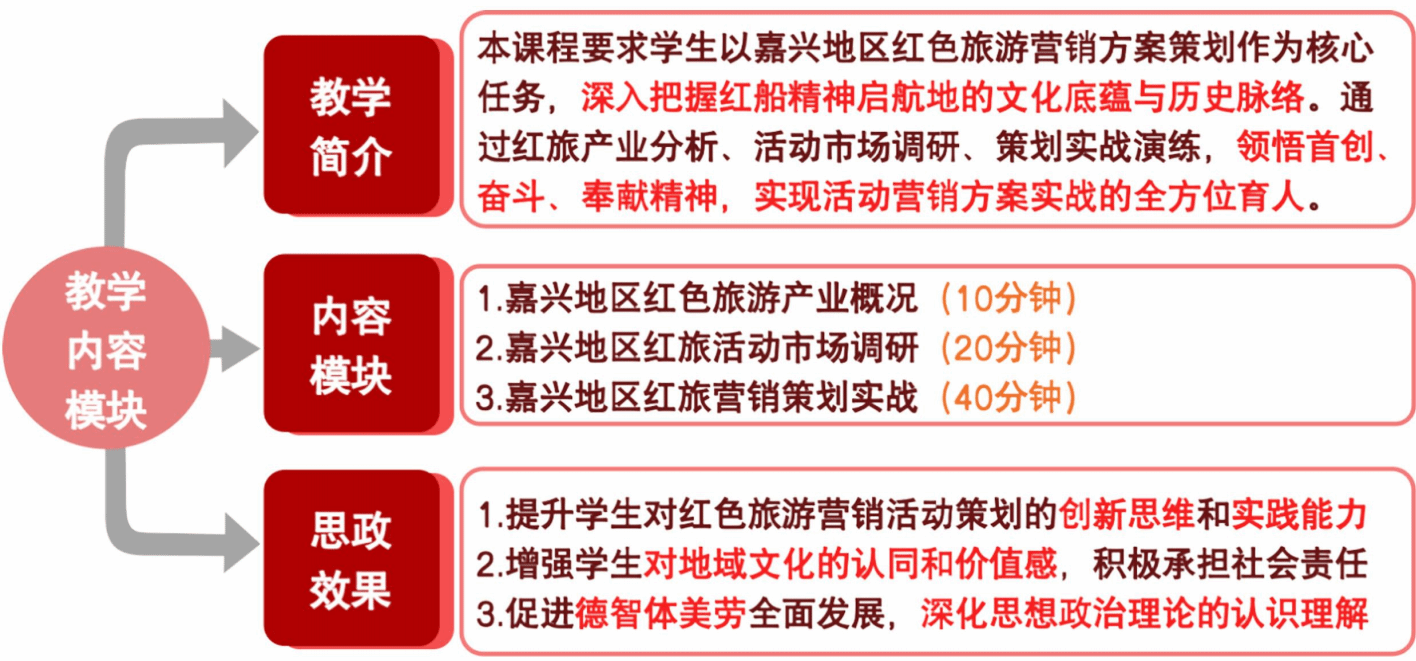 不同于以往泛泛而談的紅色文化和課程思政授課模式,本項目作為地域文化活動策劃實戰的重要模塊,聚焦江浙滬(尤以嘉興為中心)地區的紅色文化歷史和革命精神,讓學生有相對明確的課程思政學習方向,通過一門課程的一個模塊深度把握地區紅旅文化精髓,以“紅船精神”作為明晰透徹的落腳點,便于學生系統掌握課程思政的核心內涵,避免停滯于淺薄的認知層面。