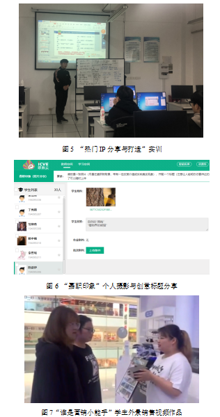 情景項目實操:市場營銷的每個教學模塊都會設計小組或個人實訓項目,例如“新媒體營銷”章節中設計“熱門IP分享與打造”實訓、“嘉職印象”攝影與創意標題大賽,“市場環境分析”章節中“五力模型”和“SWOT分析”里分別設計“競爭力對抗分析”實訓、“中國非遺傳統文化”環境分析,“STP”章節中設計“中國本土服裝品牌”STP分析、“天貓高校名人堂”大案例分析,“4P營銷戰略與策劃”中設計“品牌星(新)推官”為品牌打造新產品定位、新包裝和新推廣策略,“營銷溝通”中通過實景視頻拍攝設計“誰是營銷小能手”實訓,最后是商業計劃書個人調研大作業和小組經濟案例作品二次修改作業收尾。每個章節實訓項目設計充分展示了市場營銷課程對“首創精神”的感悟和實踐,體現了管理類學生對“敢為人先,勇立潮頭”堅定信念。
