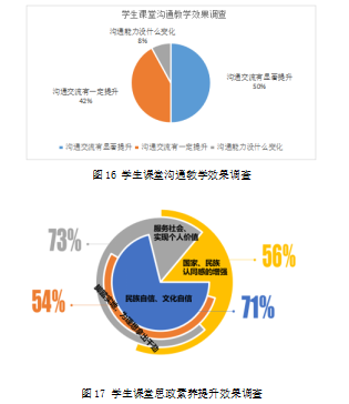 通過課內外各類形式多樣的活動項目的實施和實踐,大部分學生潛在的能力素養得到發掘和鍛煉,溝通能力提升。百分之70以上的學生認為增加了民族自信與文化自信、服務意識和個人價值實現動力等課程思政素養。