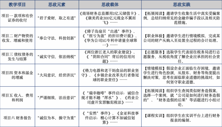 通過精確規(guī)劃,優(yōu)化內(nèi)容供給,遵循“思政教學(xué)”的內(nèi)化與外化規(guī)律,利用職教云、1+X財務(wù)共享平臺等媒體技術(shù),使思政教學(xué)隱藏在教學(xué)內(nèi)容中,選擇貼近學(xué)情的教學(xué)方法,落實“啟發(fā)——探索——思考——領(lǐng)悟——拓展——評價反饋”教學(xué)環(huán)節(jié),將思政教學(xué)春風(fēng)化雨式貫穿“課前——課中——課后”全過程,學(xué)生從感性認(rèn)識上升到理性認(rèn)識,再從理性認(rèn)識到實踐,與“知、情、意、行”形成辯證統(tǒng)一,培養(yǎng)學(xué)生守法奉公,誠信為本,嚴(yán)謹(jǐn)細(xì)致,經(jīng)世濟(jì)民的職業(yè)品格,增強(qiáng)學(xué)生職業(yè)責(zé)任感,培養(yǎng)學(xué)生成為紅船旁德才兼?zhèn)涞母咚刭|(zhì)技能人才。