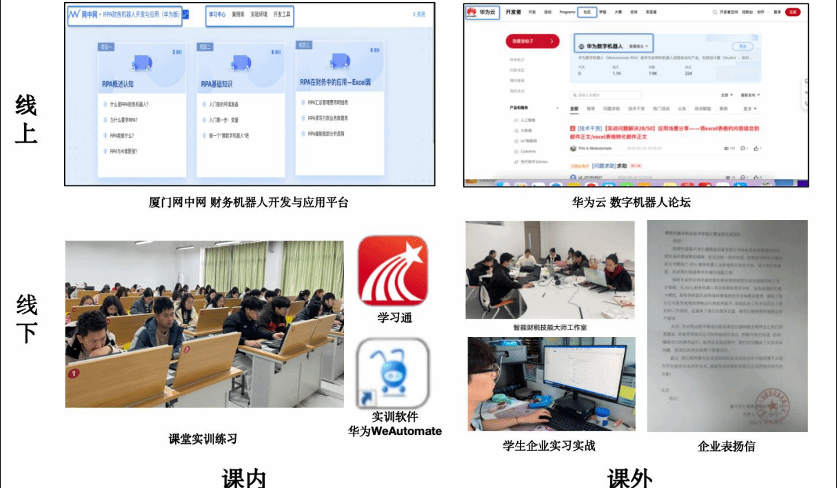 課堂作為“三進(jìn)”工作的核心與關(guān)鍵環(huán)節(jié),高職院校教育所培育的學(xué)生是未來各行各業(yè)的中堅(jiān)力量,肩負(fù)著建設(shè)和發(fā)展中國特色社會主義事業(yè)的重大使命。因此,高職院校在推進(jìn)習(xí)近平新時代中國特色社會主義思想建設(shè)的同時,注重將專業(yè)理論知識與實(shí)踐操作緊密融合,深化學(xué)生對職業(yè)理想和職業(yè)道德的認(rèn)知與理解。線上線下融合,深化技能道德。《財(cái)務(wù)機(jī)器人應(yīng)用》充分利用線上豐富的教學(xué)資源,進(jìn)行線上探學(xué),通過“學(xué)習(xí)通”“云課堂”等教學(xué)平臺,積極探索新的課程思政方法。微課視頻讓學(xué)生自主了解財(cái)會信息化發(fā)展,學(xué)習(xí)財(cái)務(wù)機(jī)器人的基本知識和操作技能,增加學(xué)生視野的廣度和思維的深度的同時激發(fā)人才創(chuàng)新活力的創(chuàng)新驅(qū)動發(fā)展戰(zhàn)略,引導(dǎo)學(xué)生樹立與時俱進(jìn)意識、創(chuàng)新精神;線下課堂教學(xué)通過教師講解、虛擬實(shí)驗(yàn)、實(shí)踐操作、小組討論、個人展示等教學(xué)手段,深化學(xué)生對知識的理解和應(yīng)用,規(guī)范數(shù)字技能操作,提升技能道德。課內(nèi)課外互動,培育職業(yè)道德。課內(nèi)依托“校內(nèi)智能財(cái)稅技能大師工作室+橫項(xiàng)課題”工學(xué)結(jié)合,耦合虛擬仿真和實(shí)戰(zhàn)演練,將企業(yè)真實(shí)的業(yè)務(wù)流程融入教學(xué)內(nèi)容,還原業(yè)財(cái)稅真實(shí)場景,實(shí)現(xiàn)“學(xué)中做、做中創(chuàng)、創(chuàng)中研”,教學(xué)研結(jié)合攻克技能關(guān),提升學(xué)生業(yè)務(wù)流程管理能力與數(shù)字應(yīng)用能力;課外通過稅務(wù)局志愿者服務(wù)、“共富”崗位研學(xué)等活動,拓寬學(xué)生的人文視野和素養(yǎng),引導(dǎo)學(xué)生突破專業(yè)的“技術(shù)理性”,增加職業(yè)認(rèn)同,提高職業(yè)素養(yǎng),堅(jiān)持新發(fā)展理念。
