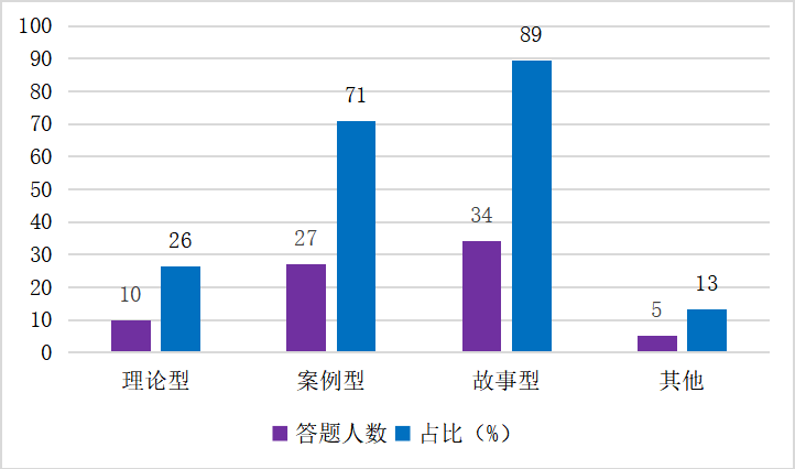 高友潤(2020)提出“研學(xué)情,知之準,識之深,教在點,才高效”[6]。學(xué)情分析,是因材施教的前期基礎(chǔ),為了讓專業(yè)課的思政效果達到最大化,可以通過問卷調(diào)查和訪談的形式,了解學(xué)生喜歡或感興趣的課程思政素材類型,以此準備思政素材。素材一般有文字、音頻、視頻、圖片、混合等形式,其中,文字素材又分理論型、案例型、故事型等。筆者對所授課的班級進行問卷調(diào)查,全班共44人,39人回答了“感興趣的課程思政素材形式”,作答率89%,學(xué)生最感興趣的為視頻素材,占比74%,其它依次是圖片、音頻、混合、文字,具體見圖3所示;對文字素材又增加“理論型、案例型、故事型”問題選項,38人回答,作答率86%,學(xué)生最感興趣的是故事型,占比89%,其次是案例型,具體見圖4所示,從被調(diào)查者班級學(xué)情分析來看,大部分學(xué)生感興趣的課程思政素材是視頻,文字素材是最不感興趣的,如果想以文字素材進行課程思政教育,那最好采用故事型文字材料。