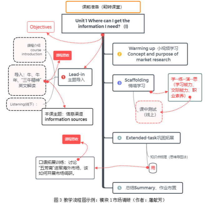 采取三階教學:“三進”工作,怎么進很關鍵。本課程教學通過學--練--演,互動教學、合作操練、拓展演繹,訓練學生就某個主題流暢地進行表達的能力。同時在教學過程中,融入信息時代的新思想、新觀念和新價值觀,引導學生學會用英語思考問題、用英文向國外友人講好中國故事,引導學生樹立正確的價值觀,增加學生的職業認同感、自豪感,提升學生思政素養。最后,利用線上教學平臺布置自主學習和探究內容。教師提供開放式討論話題,鼓勵學生通過各種渠道自主學習和探究,提高學生的學習能力、思辨能力和適應能力。例如:以“市場調研”模塊的教學為例(圖3),首先以外交部發言人華春瑩對“三牛精神”(Three Ox Spirit)的英文解讀導入,學生搜集不同文化下牛的表達與內涵,在不同文化的交流和碰撞中塑造文化自信以及正確的人生觀、價值觀,同時引出主題---信息渠道以及如何作市場調研。通過情境學習,開展市場調研相關互動討論。繼而在小組操練中,提升團隊合作意識及語言技能。然后圍繞中國制造或本土品牌(比如“五芳齋”公司海外市場拓展)開展口語拓展練習并演繹,激發語言學習的熱情,同時增強愛國意識和文化自信。