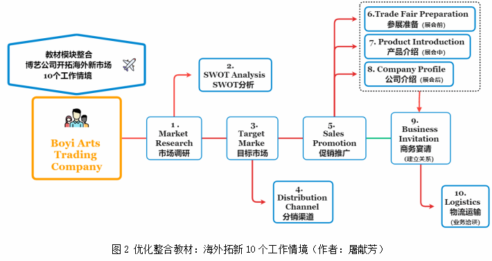 圍繞一條主線:“三進”工作,進教材是基礎。通過優化整合教材內容,確定以博藝公司開拓海外新市場的10個工作情境為主線(圖2),結合語言學習特點,以“中國制造海外拓新”為載體,挖掘各模塊思政點;借助線上教學平臺,拓展補充思政語料《理解當代中國》,提升教材內容的契合度,實現“三貼近”--貼近實際、貼近學生、貼近崗位需求,著力培養具有人文素養、家國情懷、國際視野,跨文化溝通能力的外語復合型人才。