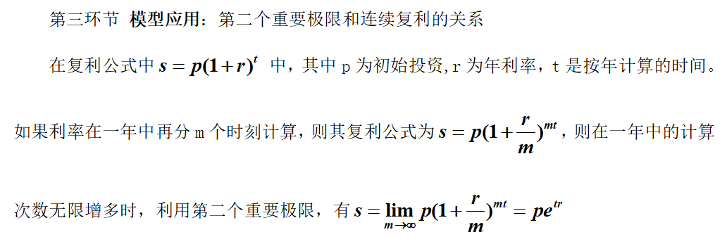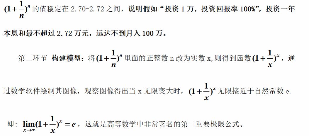 課前:發布相關思政育人資源《國王和一粒米》的故事以及近年來投資詐騙的熱點案例,布置任務——查找復利問題資料,了解復利數學模型。通過課前學習,一方面使學生通過自主學習激發學習第二重要極限的興趣;另一方面啟發學生從數學的角度科學地分析金融、保險、投資和借貸等實際問題,幫助學生提高辨別能力和防范意識。