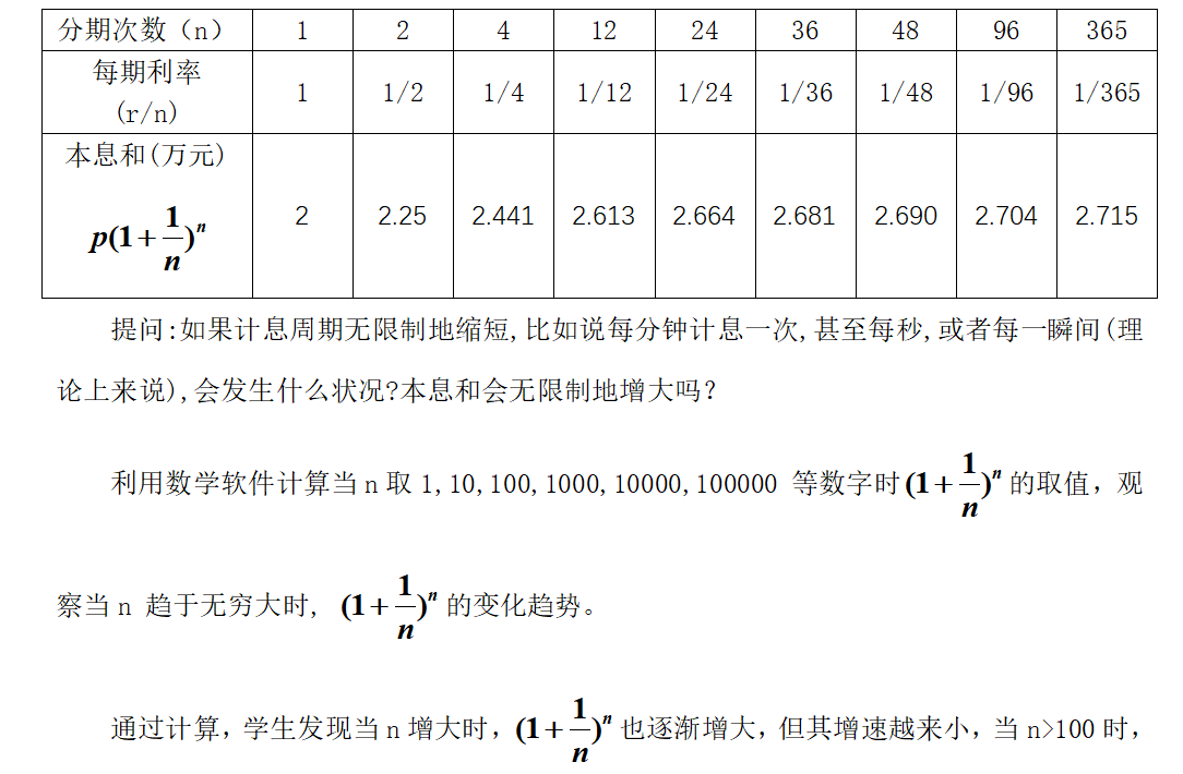課中:第一環節 案例引入:以“投資1萬,月入100萬,投資匯報率100%”為研究對象,引導學生以復利的形式計算不同計息周期下的本息和。以本金為1萬元人民幣為例(即p=10000),假設年利率為100%(r=100%),以一年為期,要求學生分別計算一年計息一次,每半年計息一次,每季度計息一次,每月計息一次,每半月計息一次(即一年計息1次、2次、4次、12次、24次)……等不同情況下的本息和,并完成下表中不同計息方式下本息和的計算。