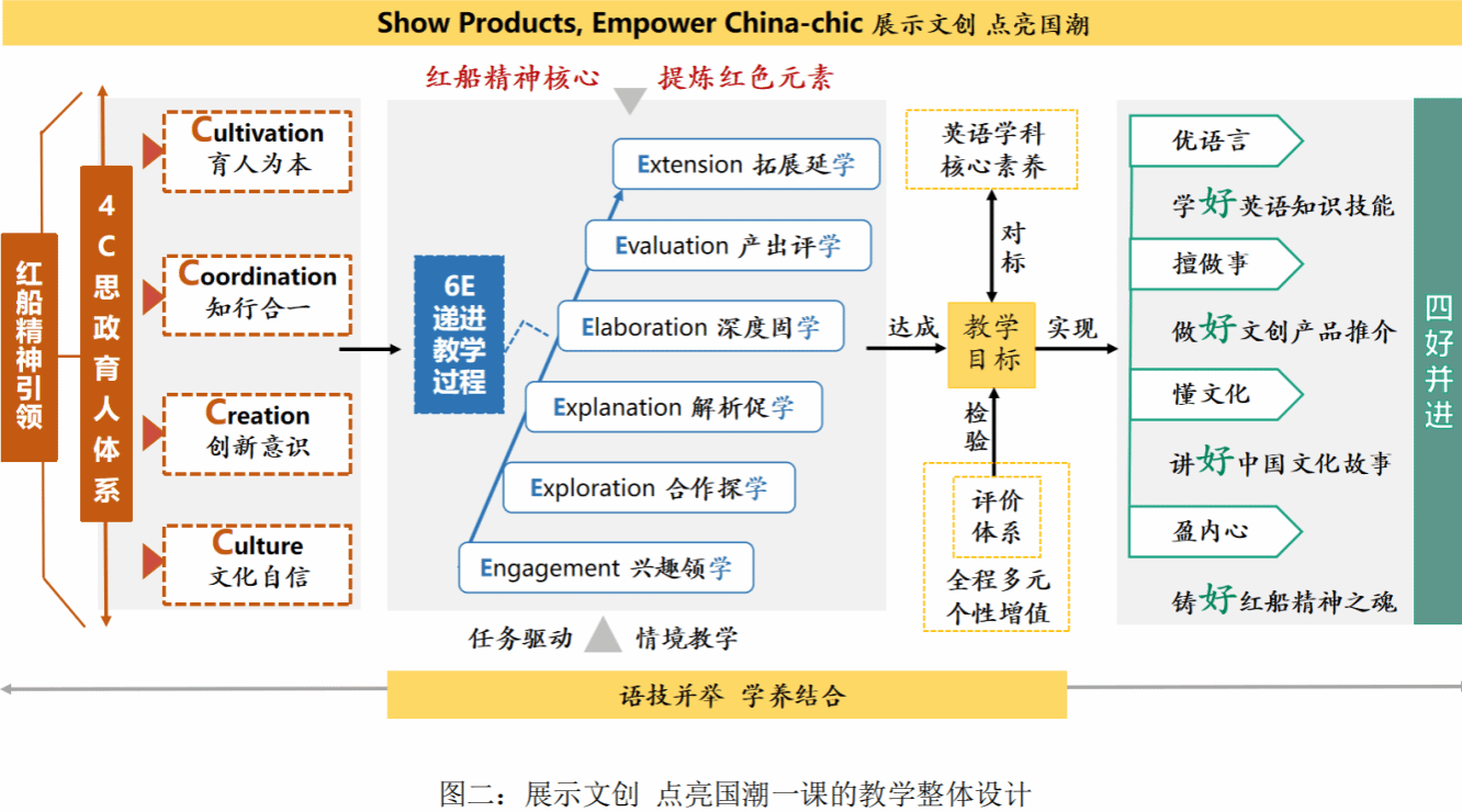 Show Products, Empower China-chic(展示文創 點亮國潮)一課選自拓展模塊四 China-chic Cultural Products(國潮文創)。授課對象為文化創意策劃專業 2022 級 1 班學生。依據語言學科核心素養發展要求與職業語用需求,將 4C 思政育人要素全面滲透至教學目標、內容、手段與評價。在建構主義 5E 教學模式上增加了 Extension(課后拓展延學)環節,形成 6E 遞進教學模式。以紅色文化為亮點,采用任務驅動、情境教學等多種教法學法,搭建知識支架;以紅船精神為核心,構建職業情境,打造沉浸式英語學習環境;靈活活使用資源手段破重化難,全過程多元評價,以核心素養為基礎,語技并舉,學養結合,將課程優語言、擅做事、懂文化、盈內心的目標具象化為四“好”并進教學效果。