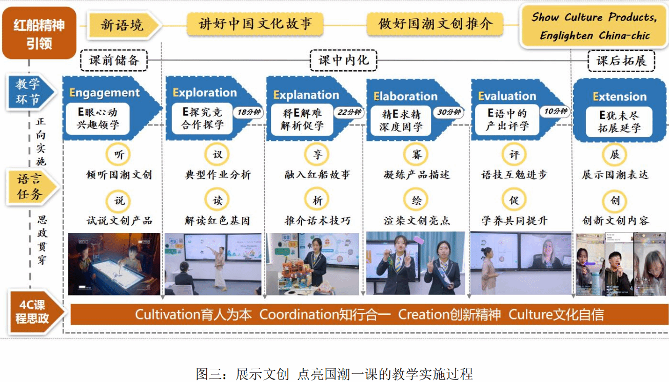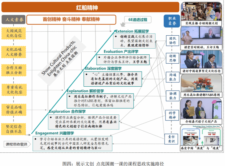 以德育為,,育人為本,以紅船精神為指引,以文創推助助力國潮出圈為內容載體 4C 課程思政為體系進行思政傳達。學生從課前穿越歷史,走進現實,用心感受中國人的智慧,到課中對紅船故事進一步理解,再到融紅色基因和中國傳統文化元素于語言的表達,直至課外實踐直播,展現文化自信,引導學生做有追求、有膽識、有擔當的紅船青年。