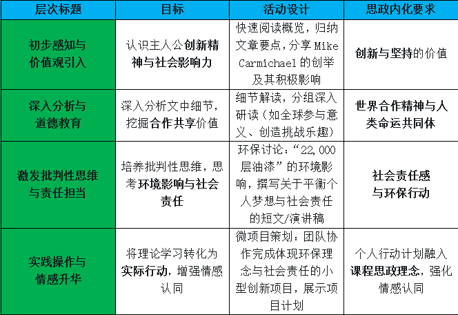 為了閱讀材料《Creating the World's Largest Ball of Paint》中的思政元素與習(xí)近平新時(shí)代中國(guó)特色社會(huì)主義思想充分融合,案例從“初步感知與價(jià)值觀引入”“深入分析與道德教育”“激發(fā)批判性思維與責(zé)任擔(dān)當(dāng)”“實(shí)踐操作與情感升華”四個(gè)層次設(shè)計(jì)精讀活動(dòng)(簡(jiǎn)稱為“四階活動(dòng)方案”),引導(dǎo)學(xué)生感知并領(lǐng)悟其中“創(chuàng)新與堅(jiān)持”“合作共享”“環(huán)保”等思政元素和社會(huì)價(jià)值,從而將習(xí)近平新時(shí)代中國(guó)特色社會(huì)主義思想核心價(jià)值觀自然融入課堂教學(xué),潛移默化式的進(jìn)入學(xué)生頭腦并轉(zhuǎn)化為具體行動(dòng)。以下為“四階活動(dòng)方案設(shè)計(jì)表”: